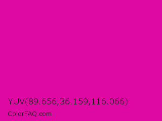 YUV 89.656,36.159,116.066 Color is a normal magenta color and the nearest color is Hollywood Cerise #f400a1. Hex code #de08a3 and RGB value is rgb(222,8,163). In RGB color space, this color is composed of 87% red, 3% green, 64% blue, In CMYK color space, this color is composed of 0% cyan, 96% magenta, 27% yellow , 13% black , In HSL color space, this color has a hue angle of 317° , 93% saturation and 45% lightness.