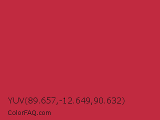 YUV 89.657,-12.649,90.632 Color is a normal red color and the nearest color is Brick Red #c62d42. Hex code #c12a40 and RGB value is rgb(193,42,64). In RGB color space, this color is composed of 76% red, 16% green, 25% blue, In CMYK color space, this color is composed of 0% cyan, 78% magenta, 67% yellow , 24% black , In HSL color space, this color has a hue angle of 351° , 64% saturation and 46% lightness.