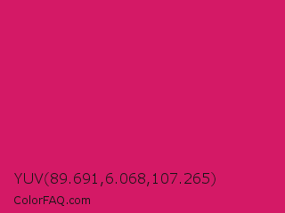 YUV 89.691,6.068,107.265 Color is a normal rose color and the nearest color is Dogwood Rose #d71868. Hex code #d41966 and RGB value is rgb(212,25,102). In RGB color space, this color is composed of 83% red, 10% green, 40% blue, In CMYK color space, this color is composed of 0% cyan, 88% magenta, 52% yellow , 17% black , In HSL color space, this color has a hue angle of 335° , 79% saturation and 46% lightness.
