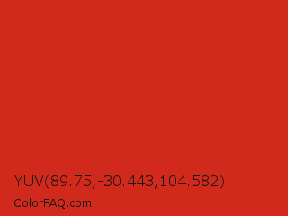 YUV 89.75,-30.443,104.582 Color is a normal red color and the nearest color is Maximum Red #d92121. Hex code #d1291c and RGB value is rgb(209,41,28). In RGB color space, this color is composed of 82% red, 16% green, 11% blue, In CMYK color space, this color is composed of 0% cyan, 80% magenta, 87% yellow , 18% black , In HSL color space, this color has a hue angle of 4° , 76% saturation and 46% lightness.