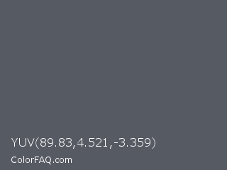 YUV 89.83,4.521,-3.359 Color is a normal blue color and the nearest color is Scarpa Flow #585562. Hex code #565a63 and RGB value is rgb(86,90,99). In RGB color space, this color is composed of 34% red, 35% green, 39% blue, In CMYK color space, this color is composed of 13% cyan, 9% magenta, 0% yellow , 61% black , In HSL color space, this color has a hue angle of 222° , 7% saturation and 36% lightness.