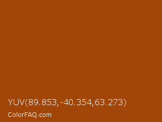 YUV 89.853,-40.354,63.273 Color is a normal orange color and the nearest color is Oregon #9b4703. Hex code #a24508 and RGB value is rgb(162,69,8). In RGB color space, this color is composed of 64% red, 27% green, 3% blue, In CMYK color space, this color is composed of 0% cyan, 57% magenta, 95% yellow , 36% black , In HSL color space, this color has a hue angle of 24° , 91% saturation and 33% lightness.