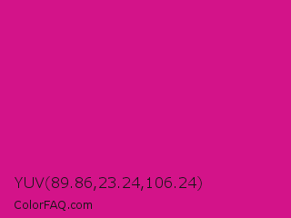 YUV 89.86,23.24,106.24 Color is a normal magenta color and the nearest color is Red Violet #c71585. Hex code #d31389 and RGB value is rgb(211,19,137). In RGB color space, this color is composed of 83% red, 7% green, 54% blue, In CMYK color space, this color is composed of 0% cyan, 91% magenta, 35% yellow , 17% black , In HSL color space, this color has a hue angle of 323° , 83% saturation and 45% lightness.