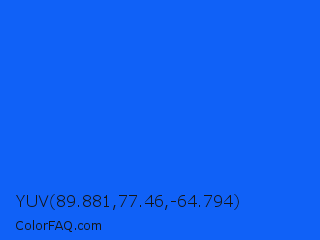 YUV 89.881,77.46,-64.794 Color is a normal blue color and the nearest color is Blue Ribbon #0066ff. Hex code #1061f7 and RGB value is rgb(16,97,247). In RGB color space, this color is composed of 6% red, 38% green, 97% blue, In CMYK color space, this color is composed of 94% cyan, 61% magenta, 0% yellow , 3% black , In HSL color space, this color has a hue angle of 219° , 94% saturation and 52% lightness.