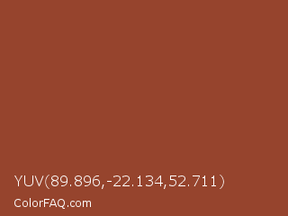 YUV 89.896,-22.134,52.711 Color is a normal red color and the nearest color is Chestnut #954535. Hex code #96442d and RGB value is rgb(150,68,45). In RGB color space, this color is composed of 59% red, 27% green, 18% blue, In CMYK color space, this color is composed of 0% cyan, 55% magenta, 70% yellow , 41% black , In HSL color space, this color has a hue angle of 13° , 54% saturation and 38% lightness.