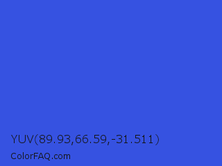 YUV 89.93,66.59,-31.511 Color is a normal blue color and the nearest color is Royal Blue #4169e1. Hex code #3652e1 and RGB value is rgb(54,82,225). In RGB color space, this color is composed of 21% red, 32% green, 88% blue, In CMYK color space, this color is composed of 76% cyan, 64% magenta, 0% yellow , 12% black , In HSL color space, this color has a hue angle of 230° , 74% saturation and 55% lightness.