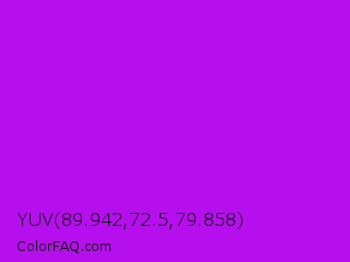 YUV 89.942,72.5,79.858 Color is a normal purple color and the nearest color is Vivid Mulberry #b80ce3. Hex code #b50fed and RGB value is rgb(181,15,237). In RGB color space, this color is composed of 71% red, 6% green, 93% blue, In CMYK color space, this color is composed of 24% cyan, 94% magenta, 0% yellow , 7% black , In HSL color space, this color has a hue angle of 285° , 88% saturation and 49% lightness.