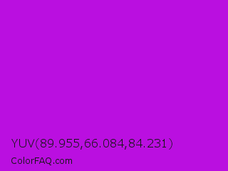 YUV 89.955,66.084,84.231 Color is a normal purple color and the nearest color is Vivid Mulberry #b80ce3. Hex code #ba0fe0 and RGB value is rgb(186,15,224). In RGB color space, this color is composed of 73% red, 6% green, 88% blue, In CMYK color space, this color is composed of 17% cyan, 93% magenta, 0% yellow , 12% black , In HSL color space, this color has a hue angle of 289° , 87% saturation and 47% lightness.