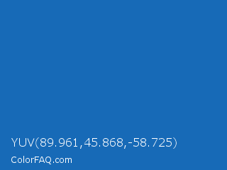 YUV 89.961,45.868,-58.725 Color is a normal blue color and the nearest color is Green Blue #1164b4. Hex code #176ab7 and RGB value is rgb(23,106,183). In RGB color space, this color is composed of 9% red, 42% green, 72% blue, In CMYK color space, this color is composed of 87% cyan, 42% magenta, 0% yellow , 28% black , In HSL color space, this color has a hue angle of 209° , 78% saturation and 40% lightness.