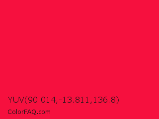 YUV 90.014,-13.811,136.8 Color is a normal red color and the nearest color is Red Ribbon #ed0a3f. Hex code #f6103e and RGB value is rgb(246,16,62). In RGB color space, this color is composed of 96% red, 6% green, 24% blue, In CMYK color space, this color is composed of 0% cyan, 93% magenta, 75% yellow , 4% black , In HSL color space, this color has a hue angle of 348° , 93% saturation and 51% lightness.
