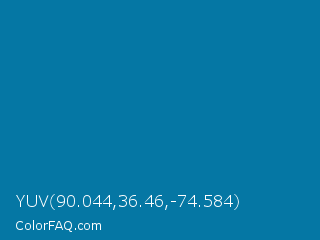 YUV 90.044,36.46,-74.584 Color is a normal blue color and the nearest color is Allports #0076a3. Hex code #0577a4 and RGB value is rgb(5,119,164). In RGB color space, this color is composed of 2% red, 47% green, 64% blue, In CMYK color space, this color is composed of 97% cyan, 27% magenta, 0% yellow , 36% black , In HSL color space, this color has a hue angle of 197° , 94% saturation and 33% lightness.