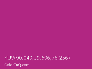 YUV 90.049,19.696,76.256 Color is a normal magenta color and the nearest color is Fandango #b53389. Hex code #b12682 and RGB value is rgb(177,38,130). In RGB color space, this color is composed of 69% red, 15% green, 51% blue, In CMYK color space, this color is composed of 0% cyan, 79% magenta, 27% yellow , 31% black , In HSL color space, this color has a hue angle of 320° , 65% saturation and 42% lightness.