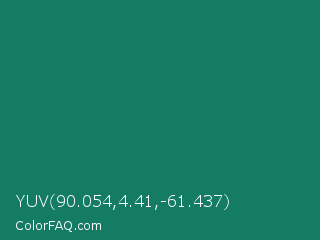 YUV 90.054,4.41,-61.437 Color is a dark cyan color and the nearest color is Deep Green Cyan Turquoise #0e7c61. Hex code #147c63 and RGB value is rgb(20,124,99). In RGB color space, this color is composed of 8% red, 49% green, 39% blue, In CMYK color space, this color is composed of 84% cyan, 0% magenta, 20% yellow , 51% black , In HSL color space, this color has a hue angle of 166° , 72% saturation and 28% lightness.