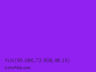 YUV 90.086,73.908,48.16 Color is a normal purple color and the nearest color is Veronica #a020f0. Hex code #9121f0 and RGB value is rgb(145,33,240). In RGB color space, this color is composed of 57% red, 13% green, 94% blue, In CMYK color space, this color is composed of 40% cyan, 86% magenta, 0% yellow , 6% black , In HSL color space, this color has a hue angle of 272° , 87% saturation and 54% lightness.