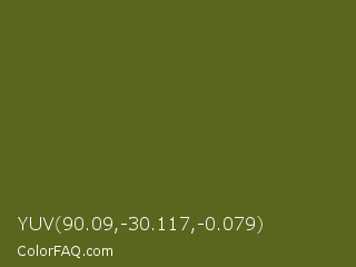 YUV 90.09,-30.117,-0.079 Color is a dark yellow color and the nearest color is Antique Bronze #665d1e. Hex code #5a661d and RGB value is rgb(90,102,29). In RGB color space, this color is composed of 35% red, 40% green, 11% blue, In CMYK color space, this color is composed of 12% cyan, 0% magenta, 72% yellow , 60% black , In HSL color space, this color has a hue angle of 70° , 56% saturation and 26% lightness.