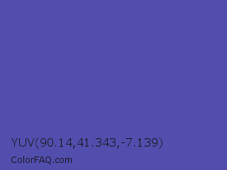 YUV 90.14,41.343,-7.139 Color is a normal indigo color and the nearest color is Plump Purple #5946b2. Hex code #524eae and RGB value is rgb(82,78,174). In RGB color space, this color is composed of 32% red, 31% green, 68% blue, In CMYK color space, this color is composed of 53% cyan, 55% magenta, 0% yellow , 32% black , In HSL color space, this color has a hue angle of 243° , 38% saturation and 49% lightness.
