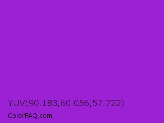 YUV 90.183,60.056,57.722 Color is a normal purple color and the nearest color is Dark Orchid #9932cc. Hex code #9c21d4 and RGB value is rgb(156,33,212). In RGB color space, this color is composed of 61% red, 13% green, 83% blue, In CMYK color space, this color is composed of 26% cyan, 84% magenta, 0% yellow , 17% black , In HSL color space, this color has a hue angle of 281° , 73% saturation and 48% lightness.