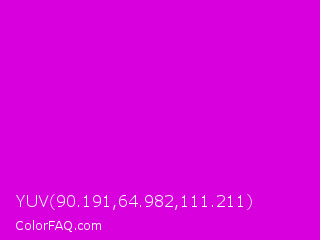 YUV 90.191,64.982,111.211 Color is a normal magenta color and the nearest color is Deep Magenta #cc00cc. Hex code #d900de and RGB value is rgb(217,-0,222). In RGB color space, this color is composed of 85% red, 0% green, 87% blue, In CMYK color space, this color is composed of 2% cyan, 100% magenta, 0% yellow , 13% black , In HSL color space, this color has a hue angle of 299° , 100% saturation and 44% lightness.