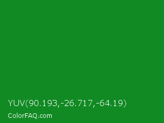 YUV 90.193,-26.717,-64.19 Color is a dark green color and the nearest color is Forest Green #228b22. Hex code #118a24 and RGB value is rgb(17,138,36). In RGB color space, this color is composed of 7% red, 54% green, 14% blue, In CMYK color space, this color is composed of 88% cyan, 0% magenta, 74% yellow , 46% black , In HSL color space, this color has a hue angle of 129° , 78% saturation and 30% lightness.