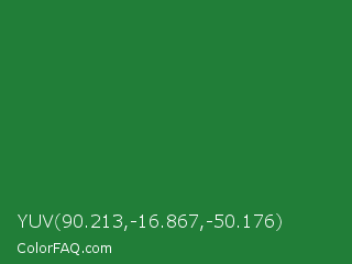 YUV 90.213,-16.867,-50.176 Color is a normal green color and the nearest color is Dark Spring Green #177245. Hex code #217e38 and RGB value is rgb(33,126,56). In RGB color space, this color is composed of 13% red, 49% green, 22% blue, In CMYK color space, this color is composed of 74% cyan, 0% magenta, 56% yellow , 51% black , In HSL color space, this color has a hue angle of 135° , 58% saturation and 31% lightness.