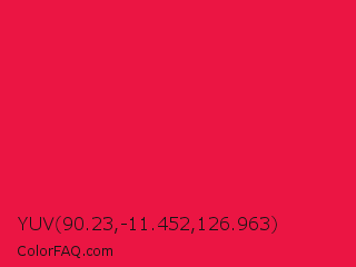 YUV 90.23,-11.452,126.963 Color is a normal red color and the nearest color is Red Ribbon #ed0a3f. Hex code #eb1543 and RGB value is rgb(235,21,67). In RGB color space, this color is composed of 92% red, 8% green, 26% blue, In CMYK color space, this color is composed of 0% cyan, 91% magenta, 71% yellow , 8% black , In HSL color space, this color has a hue angle of 347° , 84% saturation and 50% lightness.