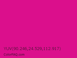 YUV 90.246,24.529,112.917 Color is a normal magenta color and the nearest color is Vivid Cerise #da1d81. Hex code #db0f8c and RGB value is rgb(219,15,140). In RGB color space, this color is composed of 86% red, 6% green, 55% blue, In CMYK color space, this color is composed of 0% cyan, 93% magenta, 36% yellow , 14% black , In HSL color space, this color has a hue angle of 323° , 87% saturation and 46% lightness.