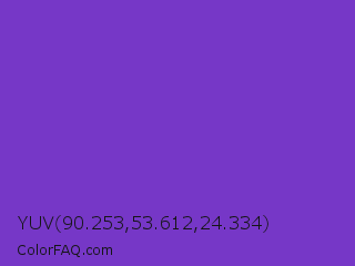 YUV 90.253,53.612,24.334 Color is a normal violet color and the nearest color is Purple Heart Crayola #652dc1. Hex code #7637c7 and RGB value is rgb(118,55,199). In RGB color space, this color is composed of 46% red, 22% green, 78% blue, In CMYK color space, this color is composed of 41% cyan, 72% magenta, 0% yellow , 22% black , In HSL color space, this color has a hue angle of 266° , 57% saturation and 50% lightness.