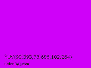 YUV 90.393,78.686,102.264 Color is a normal purple color and the nearest color is Vivid Orchid #cc00ff. Hex code #cf00fa and RGB value is rgb(207,-0,250). In RGB color space, this color is composed of 81% red, 0% green, 98% blue, In CMYK color space, this color is composed of 17% cyan, 100% magenta, 0% yellow , 2% black , In HSL color space, this color has a hue angle of 290° , 100% saturation and 49% lightness.