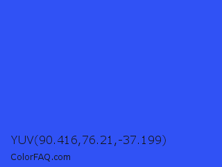 YUV 90.416,76.21,-37.199 Color is a normal blue color and the nearest color is Ultramarine Blue #4166f5. Hex code #3052f5 and RGB value is rgb(48,82,245). In RGB color space, this color is composed of 19% red, 32% green, 96% blue, In CMYK color space, this color is composed of 80% cyan, 67% magenta, 0% yellow , 4% black , In HSL color space, this color has a hue angle of 230° , 91% saturation and 57% lightness.