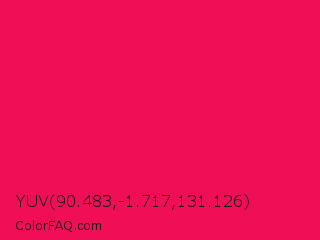 YUV 90.483,-1.717,131.126 Color is a normal rose color and the nearest color is Razzmatazz Crayola #e30b5c. Hex code #f00f57 and RGB value is rgb(240,15,87). In RGB color space, this color is composed of 94% red, 6% green, 34% blue, In CMYK color space, this color is composed of 0% cyan, 94% magenta, 64% yellow , 6% black , In HSL color space, this color has a hue angle of 341° , 88% saturation and 50% lightness.
