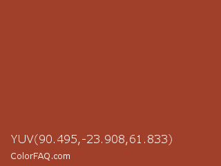 YUV 90.495,-23.908,61.833 Color is a normal red color and the nearest color is Sweet Brown #a83731. Hex code #a1402a and RGB value is rgb(161,64,42). In RGB color space, this color is composed of 63% red, 25% green, 16% blue, In CMYK color space, this color is composed of 0% cyan, 60% magenta, 74% yellow , 37% black , In HSL color space, this color has a hue angle of 11° , 59% saturation and 40% lightness.