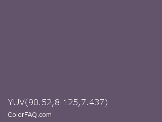 YUV 90.52,8.125,7.437 Color is a normal purple color and the nearest color is Smoky #605b73. Hex code #63536b and RGB value is rgb(99,83,107). In RGB color space, this color is composed of 39% red, 33% green, 42% blue, In CMYK color space, this color is composed of 7% cyan, 22% magenta, 0% yellow , 58% black , In HSL color space, this color has a hue angle of 280° , 13% saturation and 37% lightness.
