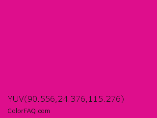 YUV 90.556,24.376,115.276 Color is a normal magenta color and the nearest color is Vivid Cerise #da1d81. Hex code #de0e8c and RGB value is rgb(222,14,140). In RGB color space, this color is composed of 87% red, 5% green, 55% blue, In CMYK color space, this color is composed of 0% cyan, 94% magenta, 37% yellow , 13% black , In HSL color space, this color has a hue angle of 324° , 88% saturation and 46% lightness.