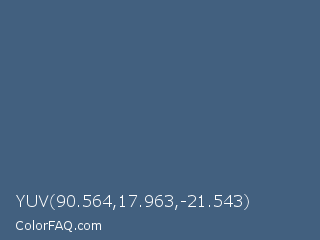 YUV 90.564,17.963,-21.543 Color is a normal blue color and the nearest color is Blue Bayoux #496679. Hex code #42607f and RGB value is rgb(66,96,127). In RGB color space, this color is composed of 26% red, 38% green, 50% blue, In CMYK color space, this color is composed of 48% cyan, 24% magenta, 0% yellow , 50% black , In HSL color space, this color has a hue angle of 210° , 32% saturation and 38% lightness.