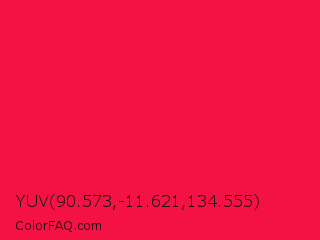 YUV 90.573,-11.621,134.555 Color is a normal red color and the nearest color is Red Ribbon #ed0a3f. Hex code #f41143 and RGB value is rgb(244,17,67). In RGB color space, this color is composed of 96% red, 7% green, 26% blue, In CMYK color space, this color is composed of 0% cyan, 93% magenta, 73% yellow , 4% black , In HSL color space, this color has a hue angle of 347° , 91% saturation and 51% lightness.