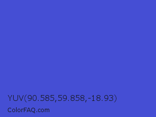YUV 90.585,59.858,-18.93 Color is a normal blue color and the nearest color is Iris #5a4fcf. Hex code #454ed4 and RGB value is rgb(69,78,212). In RGB color space, this color is composed of 27% red, 31% green, 83% blue, In CMYK color space, this color is composed of 67% cyan, 63% magenta, 0% yellow , 17% black , In HSL color space, this color has a hue angle of 236° , 62% saturation and 55% lightness.