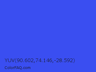 YUV 90.602,74.146,-28.592 Color is a normal blue color and the nearest color is Ultramarine Blue #4166f5. Hex code #3a4ef1 and RGB value is rgb(58,78,241). In RGB color space, this color is composed of 23% red, 31% green, 95% blue, In CMYK color space, this color is composed of 76% cyan, 68% magenta, 0% yellow , 5% black , In HSL color space, this color has a hue angle of 233° , 87% saturation and 59% lightness.