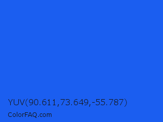 YUV 90.611,73.649,-55.787 Color is a normal blue color and the nearest color is Blue Crayola #1f75fe. Hex code #1b5ef0 and RGB value is rgb(27,94,240). In RGB color space, this color is composed of 11% red, 37% green, 94% blue, In CMYK color space, this color is composed of 89% cyan, 61% magenta, 0% yellow , 6% black , In HSL color space, this color has a hue angle of 221° , 88% saturation and 52% lightness.