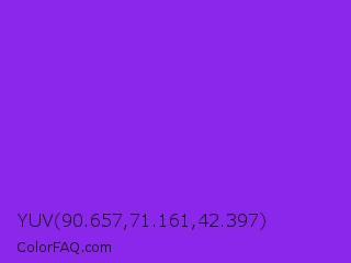 YUV 90.657,71.161,42.397 Color is a normal purple color and the nearest color is Blue Violet #8a2be2. Hex code #8b26eb and RGB value is rgb(139,38,235). In RGB color space, this color is composed of 55% red, 15% green, 92% blue, In CMYK color space, this color is composed of 41% cyan, 84% magenta, 0% yellow , 8% black , In HSL color space, this color has a hue angle of 271° , 83% saturation and 54% lightness.