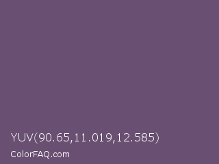 YUV 90.65,11.019,12.585 Color is a normal purple color and the nearest color is Smoky #605b73. Hex code #694f71 and RGB value is rgb(105,79,113). In RGB color space, this color is composed of 41% red, 31% green, 44% blue, In CMYK color space, this color is composed of 7% cyan, 30% magenta, 0% yellow , 56% black , In HSL color space, this color has a hue angle of 286° , 18% saturation and 38% lightness.