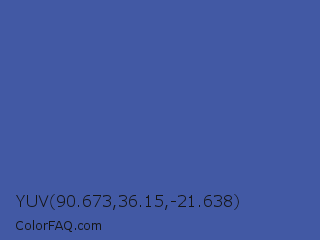 YUV 90.673,36.15,-21.638 Color is a normal blue color and the nearest color is Azure #315ba1. Hex code #4259a4 and RGB value is rgb(66,89,164). In RGB color space, this color is composed of 26% red, 35% green, 64% blue, In CMYK color space, this color is composed of 60% cyan, 46% magenta, 0% yellow , 36% black , In HSL color space, this color has a hue angle of 226° , 43% saturation and 45% lightness.