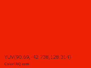YUV 90.69,-42.738,128.314 Color is a normal red color and the nearest color is Scarlet #ff2400. Hex code #ed2104 and RGB value is rgb(237,33,4). In RGB color space, this color is composed of 93% red, 13% green, 2% blue, In CMYK color space, this color is composed of 0% cyan, 86% magenta, 98% yellow , 7% black , In HSL color space, this color has a hue angle of 7° , 97% saturation and 47% lightness.