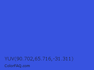 YUV 90.702,65.716,-31.311 Color is a normal blue color and the nearest color is Royal Blue #4169e1. Hex code #3753e0 and RGB value is rgb(55,83,224). In RGB color space, this color is composed of 22% red, 33% green, 88% blue, In CMYK color space, this color is composed of 75% cyan, 63% magenta, 0% yellow , 12% black , In HSL color space, this color has a hue angle of 230° , 73% saturation and 55% lightness.
