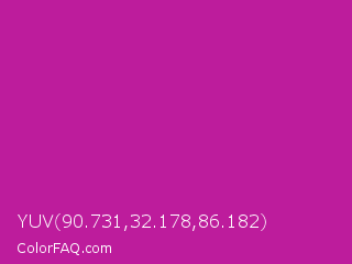 YUV 90.731,32.178,86.182 Color is a normal magenta color and the nearest color is Royal Fuchsia #ca2c92. Hex code #bd1c9c and RGB value is rgb(189,28,156). In RGB color space, this color is composed of 74% red, 11% green, 61% blue, In CMYK color space, this color is composed of 0% cyan, 85% magenta, 17% yellow , 26% black , In HSL color space, this color has a hue angle of 312° , 74% saturation and 43% lightness.