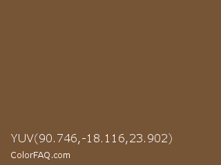 YUV 90.746,-18.116,23.902 Color is a normal orange color and the nearest color is Tuscan Brown Coffee #6f4e37. Hex code #765436 and RGB value is rgb(118,84,54). In RGB color space, this color is composed of 46% red, 33% green, 21% blue, In CMYK color space, this color is composed of 0% cyan, 29% magenta, 54% yellow , 54% black , In HSL color space, this color has a hue angle of 28° , 37% saturation and 34% lightness.
