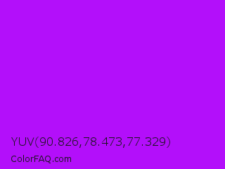 YUV 90.826,78.473,77.329 Color is a normal purple color and the nearest color is Electric Purple #bf00ff. Hex code #b30ffa and RGB value is rgb(179,15,250). In RGB color space, this color is composed of 70% red, 6% green, 98% blue, In CMYK color space, this color is composed of 28% cyan, 94% magenta, 0% yellow , 2% black , In HSL color space, this color has a hue angle of 282° , 96% saturation and 52% lightness.