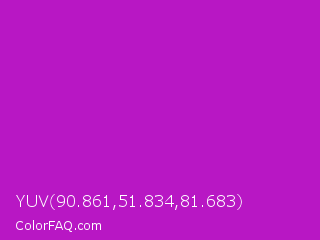YUV 90.861,51.834,81.683 Color is a normal magenta color and the nearest color is Heliotrope Magenta #aa00bb. Hex code #b817c4 and RGB value is rgb(184,23,196). In RGB color space, this color is composed of 72% red, 9% green, 77% blue, In CMYK color space, this color is composed of 6% cyan, 88% magenta, 0% yellow , 23% black , In HSL color space, this color has a hue angle of 296° , 79% saturation and 43% lightness.