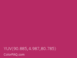 YUV 90.885,4.987,80.785 Color is a normal rose color and the nearest color is Hibiscus #b6316c. Hex code #b72a65 and RGB value is rgb(183,42,101). In RGB color space, this color is composed of 72% red, 16% green, 40% blue, In CMYK color space, this color is composed of 0% cyan, 77% magenta, 45% yellow , 28% black , In HSL color space, this color has a hue angle of 335° , 63% saturation and 44% lightness.