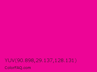 YUV 90.898,29.137,128.131 Color is a normal magenta color and the nearest color is Hollywood Cerise #f400a1. Hex code #ed0596 and RGB value is rgb(237,5,150). In RGB color space, this color is composed of 93% red, 2% green, 59% blue, In CMYK color space, this color is composed of 0% cyan, 98% magenta, 37% yellow , 7% black , In HSL color space, this color has a hue angle of 323° , 96% saturation and 47% lightness.