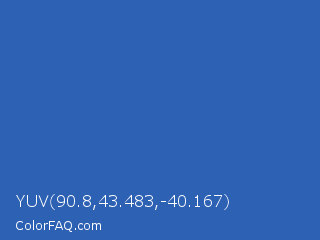YUV 90.8,43.483,-40.167 Color is a normal blue color and the nearest color is Cerulean Blue #2a52be. Hex code #2d61b3 and RGB value is rgb(45,97,179). In RGB color space, this color is composed of 18% red, 38% green, 70% blue, In CMYK color space, this color is composed of 75% cyan, 46% magenta, 0% yellow , 30% black , In HSL color space, this color has a hue angle of 217° , 60% saturation and 44% lightness.